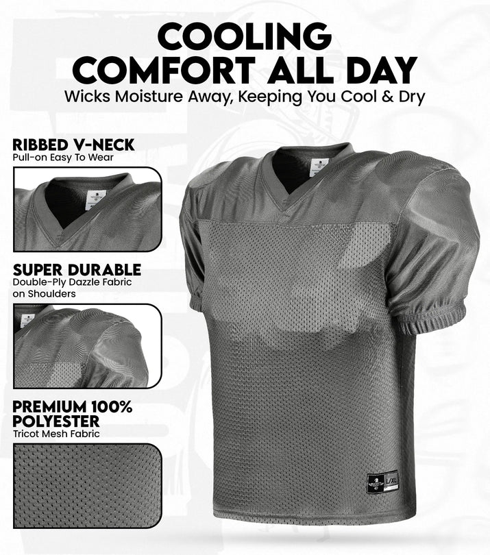 Designed for football players who demand durability, comfort, and performance. Made from 100% premium polyester, this youth football practice jersey features dazzle fabric on the cowl, neck, and sleeves for added strength and a pro-level look.Â