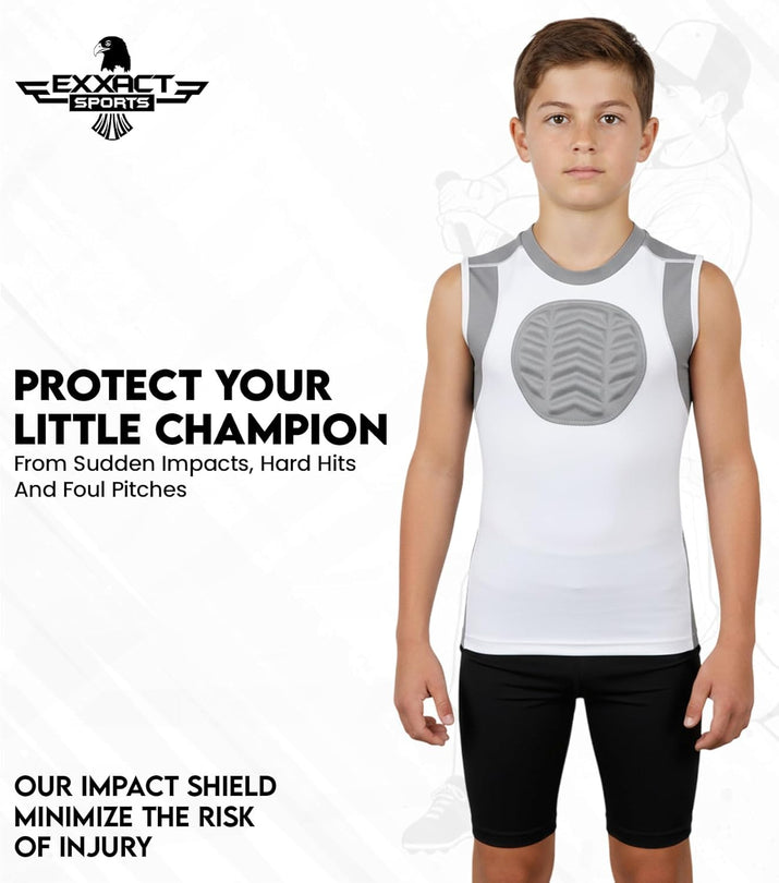 Answer 2: The 3D Impact Shield technology features ultra-light EVA flex pads that absorb and disperse impact energy effectively, providing exceptional protection against sudden hits, hard pitches, and foul balls to keep your child safe during play.