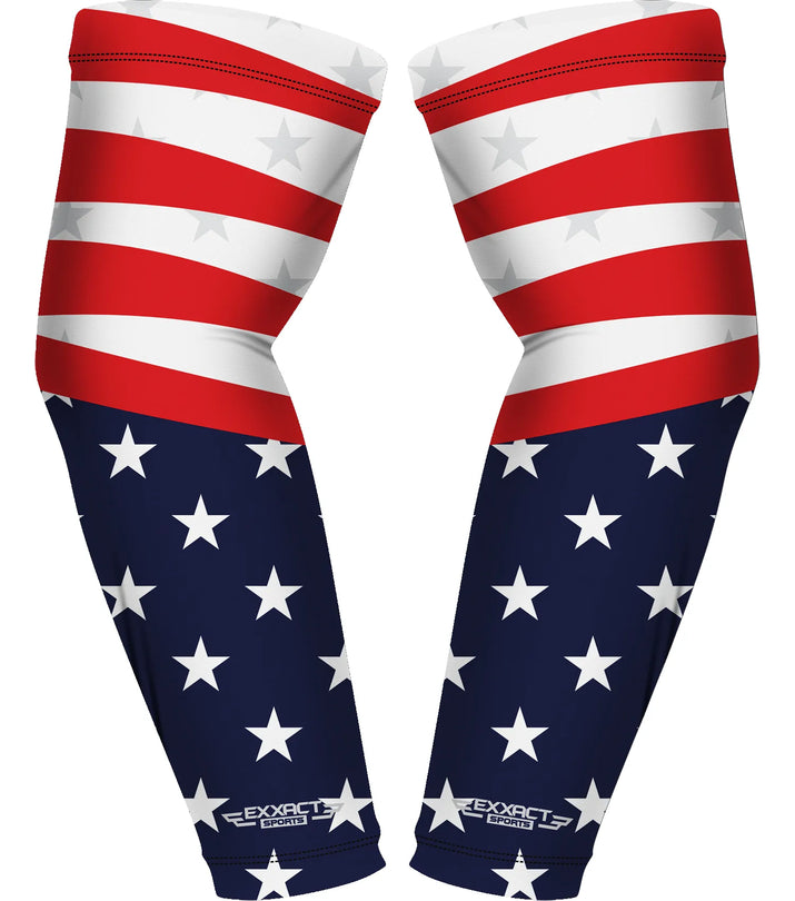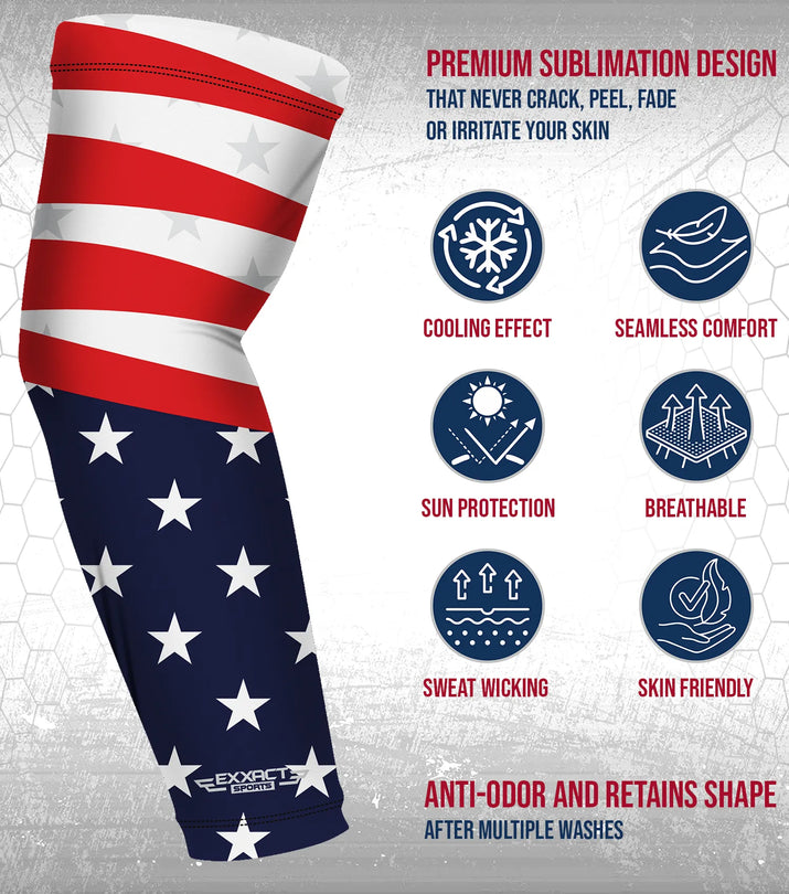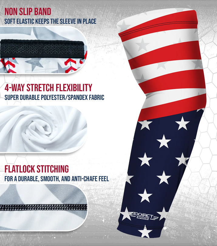 Exxact Sports Compression Arm Sleejson Redas for all ages: kids, youth and adult—perfect for both men and women. These sleeves sport a strong USA Baseball Flag look and provide a little patriotic charm with your game play.