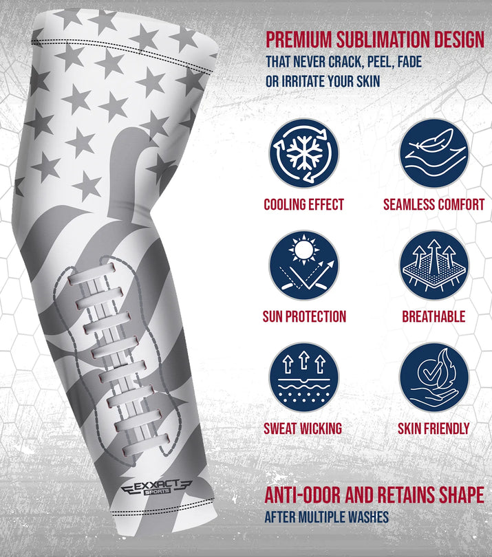 Exxact Sports' arm sleeves can help keep you protected when needed, and performing your best on the field or court with fantastic designs like our White Football Flag. Step up your game with these performance-engineered sleeves that make you stand out.