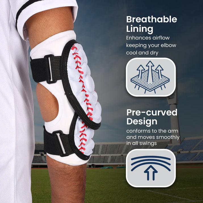 Easy and Secure Fit: Our elbow guard softball is made of skin friendly neoprene material, that provides a stylish look. With a durable hook and loop fastening and two adjustable elastic straps, you can customize the fit to your arm size to be game ready in no time.