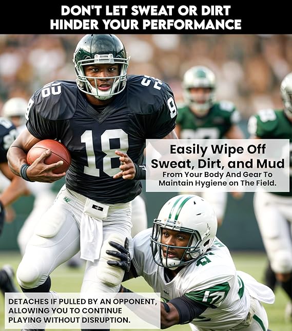 Disruption Free Gameplay: Attach to your waistband with the hook and loop fastener for a secure fit and quick access, ensuring you're always ready to wipe away sweat and maintain your grip during gameplay. Our football towel youth detaches when pulled by an opponent, allowing you to continue playing without interruptions and maintain your momentum on the field.