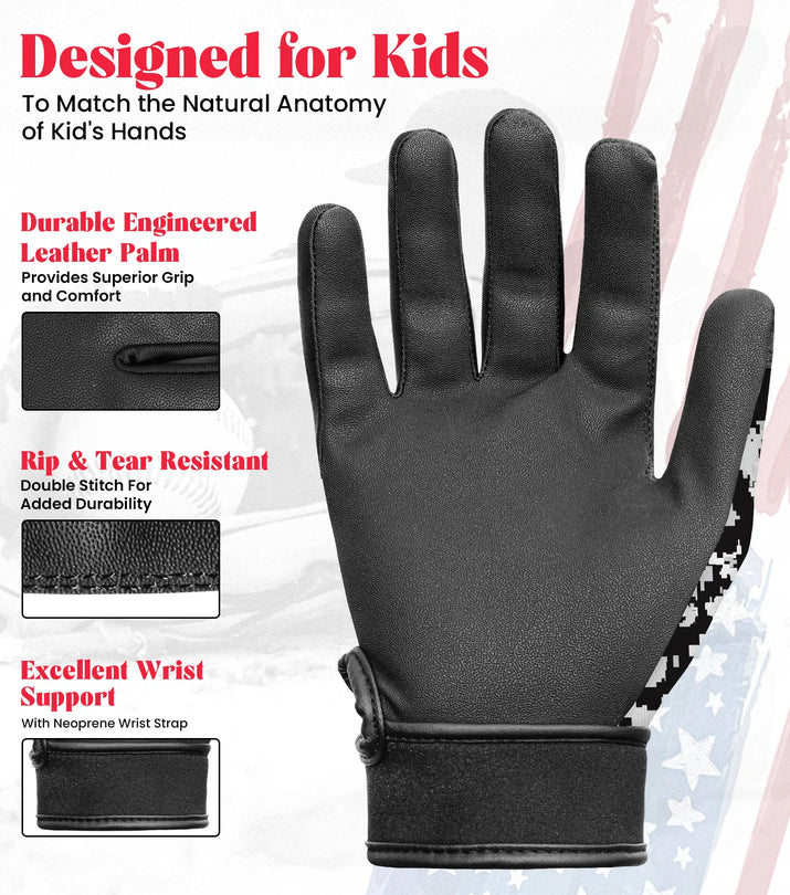Kids Baseball Batting Gloves with Arm Sleeve (Black/White Camo)