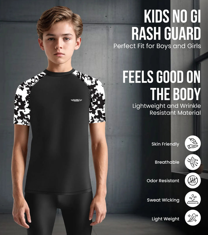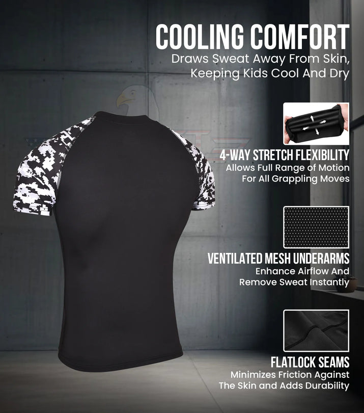 Kids Black & White Camo BJJ Rash Guard Short Sleeve