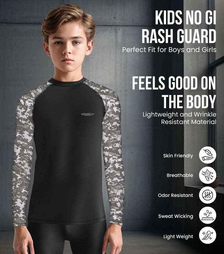 Kids Gray Camo BJJ Rash Guard Long Sleeve