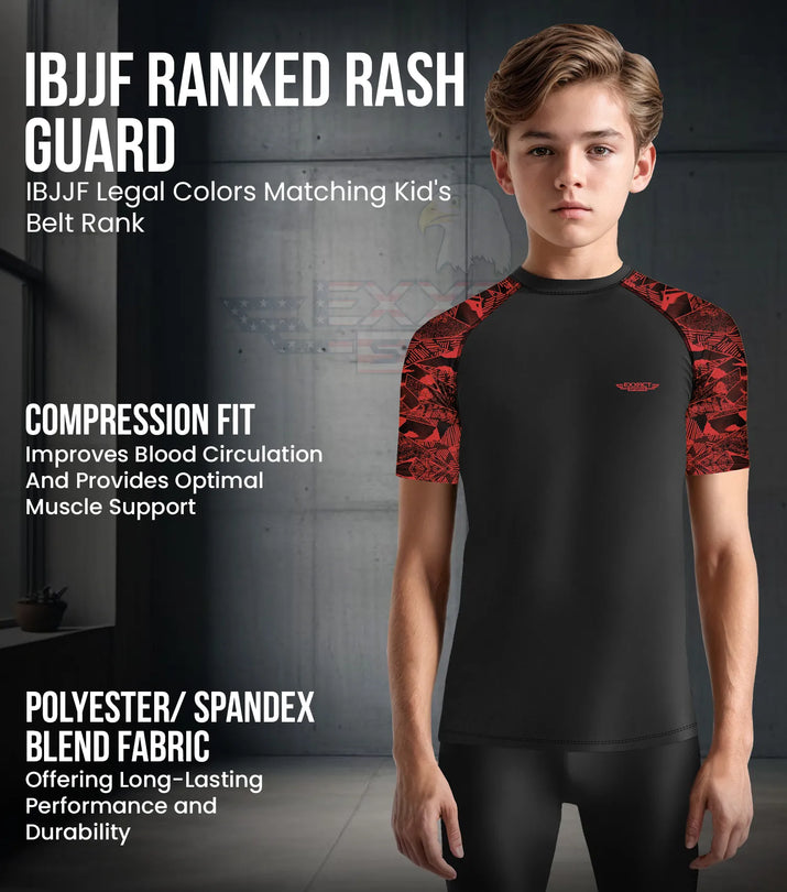 Kids Red Texture BJJ Rash Guard Short Sleeve