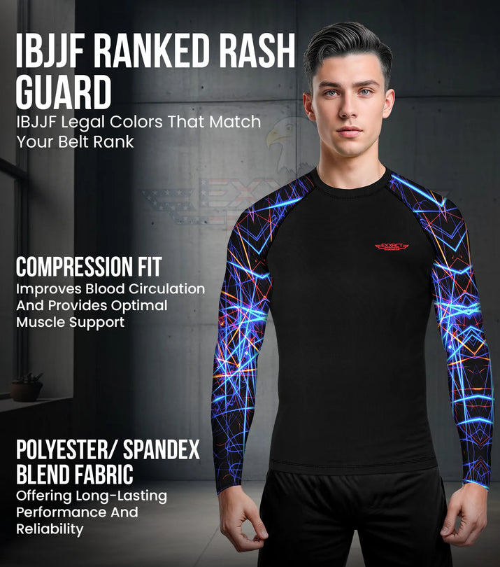 Master the Mat with Precision: Unleash your inner champion with Exxact Sports ranked rash guard bjj. Made of ultralight and durable poly-spandex odor resistant fabric, with high-quality vibrant sublimated graphics that won't fade, peel off, or irritate your skin over time. These rashguards bjj are IBJJF legal, so you can wear them to training or tournaments.