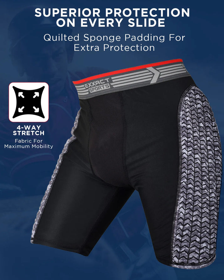 Exxact Sports Men's Padded Sliding Shorts w/Soft Form Protective Athletic Cup (Grey/Black) Intended for the motivation behind prepared competitors, these baseball sliding shorts give quality and solace to each play. Bending to slide into bases can be harsh and rigorous on the player, as it should be comfortable to make such a maneuver, the padding in these places provides softness for preservation of the leg.