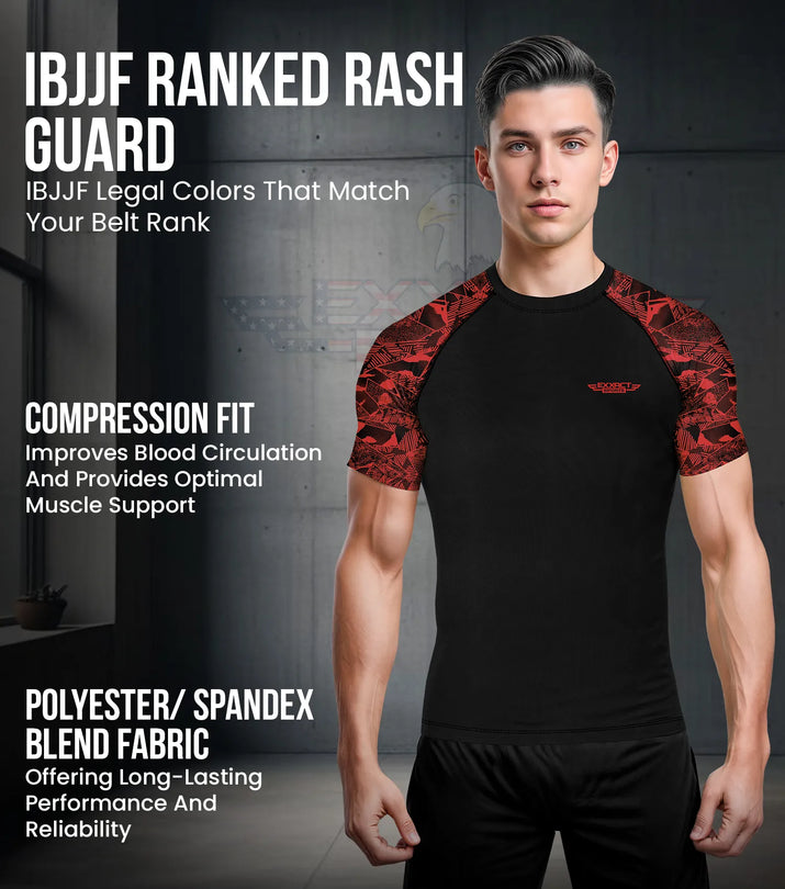 Master the Mat with Precision: Unleash your inner champion with Exxact Sports ranked rash guard bjj. Made of ultralight and durable poly-spandex odor resistant fabric, with high-quality vibrant sublimated graphics that won't fade, peel off, or irritate your skin over time. These rash guards bjj are IBJJF legal, so you can wear them to training or tournaments.