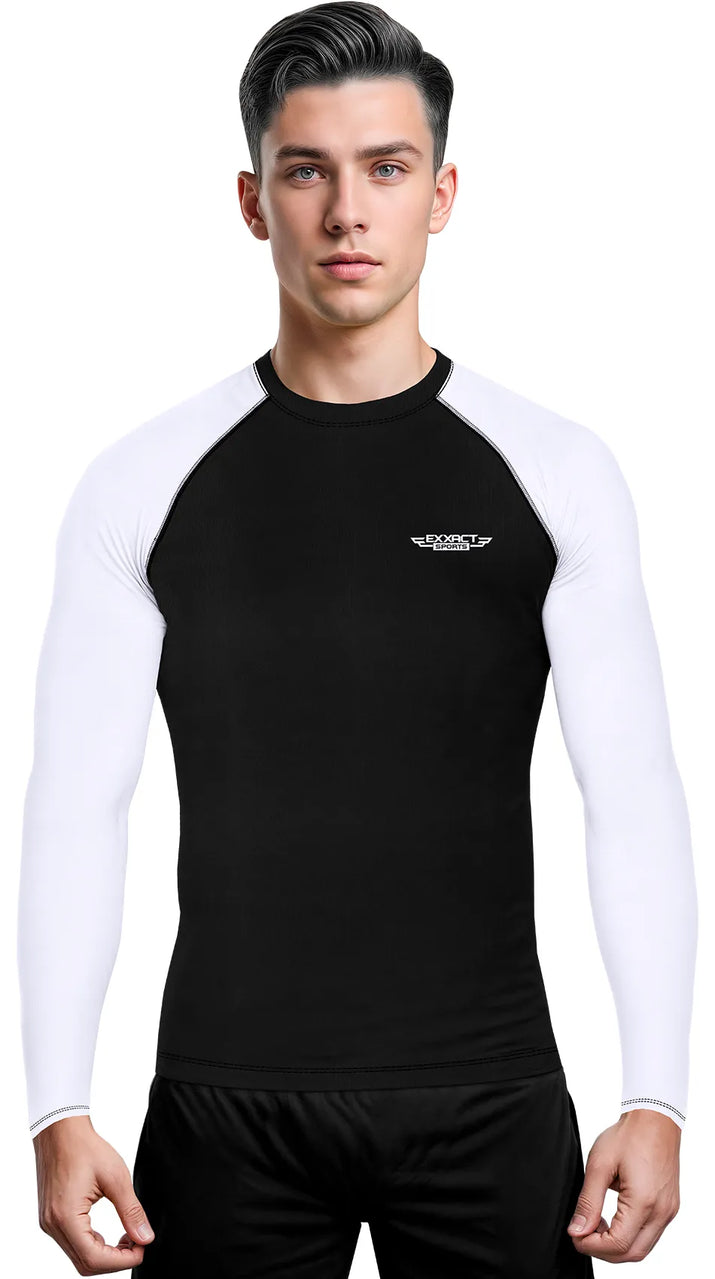 Exxact Sports Men's Black BJJ Rash Guard Long Sleeve, built for optimal performance and protection, will elevate your training. This rash guard is designed to provide comfort and durability while meeting the demands of Brazilian Jiu-Jitsu (BJJ) competitors, whether you're grappling, sparring, or executing rigorous drills.