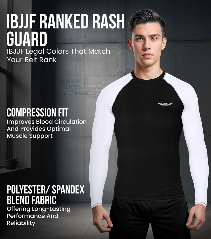 Master the Mat with Precision: Unleash your inner champion with Exxact Sports ranked rash guard bjj. Made of ultralight and durable poly-spandex odor resistant fabric, with high-quality vibrant sublimated graphics that won't fade, peel off, or irritate your skin over time. These rashguards bjj are IBJJF legal, so you can wear them to training or tournaments.