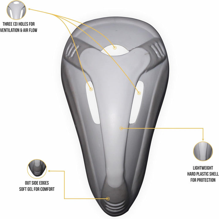 The integrated hard protective cup features a vented design for breathability, combined with a gel perimeter for enhanced comfort. This ensures maximum protection against impact while allowing air flow, keeping you comfortable during intense gameplay.