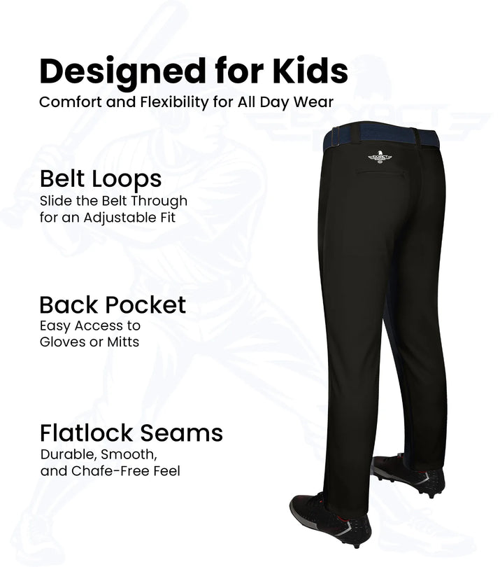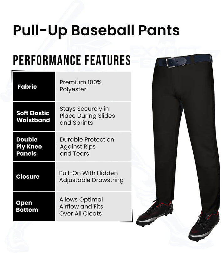 Pull-Up Boys Baseball Pants with Adjustable Drawstring, Full Length & Open Bottom (Black)