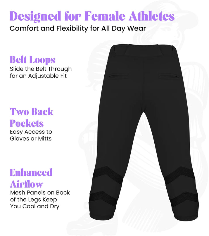 - Athletic Cut for Extra Protection - Score on the field with our softball pants for women featuring athletic cuts near the knees to give you a snug fit and extra protection. Perfect for practice or game days, these pants women offer unbeatable comfort and support so you can focus on playing your best.