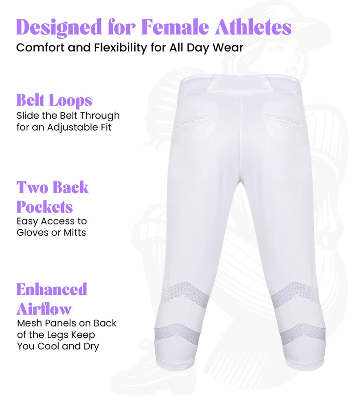 Softball Pants for Women with Snap and Zipper, Elastic Bottom, and Mesh Panels (White)