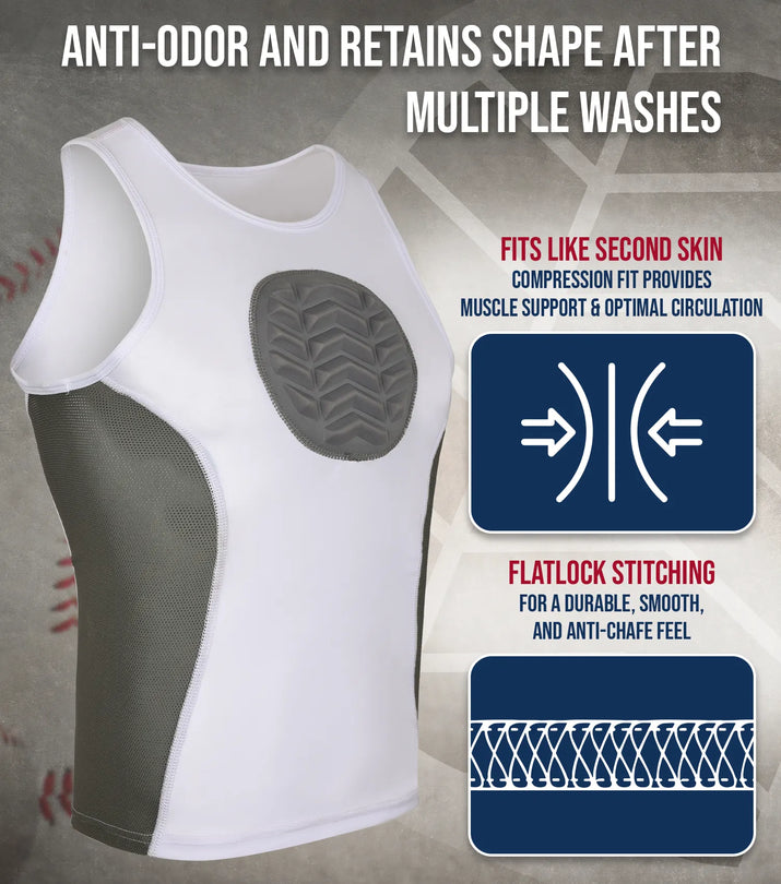 Our baseball chest protector for youth is made from breathable 4-way stretch micro-fiber mesh fabric for maximum ventilation.