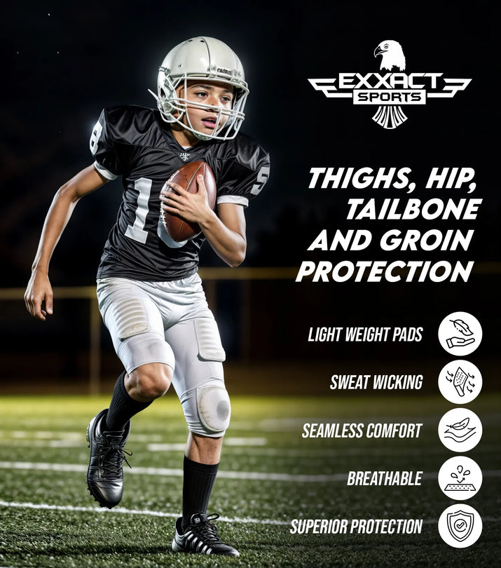 Introducing the Touchdown 5-Pad Boys Football Girdle from Exxact Sports; Get game-day ready with maximum protection and full coverage in mind for young players who put safety and performance first. Built to the highest of standards we have 5 pads that are positioned in key areas whilst everything is held securely in place by one powerful elasticated design.